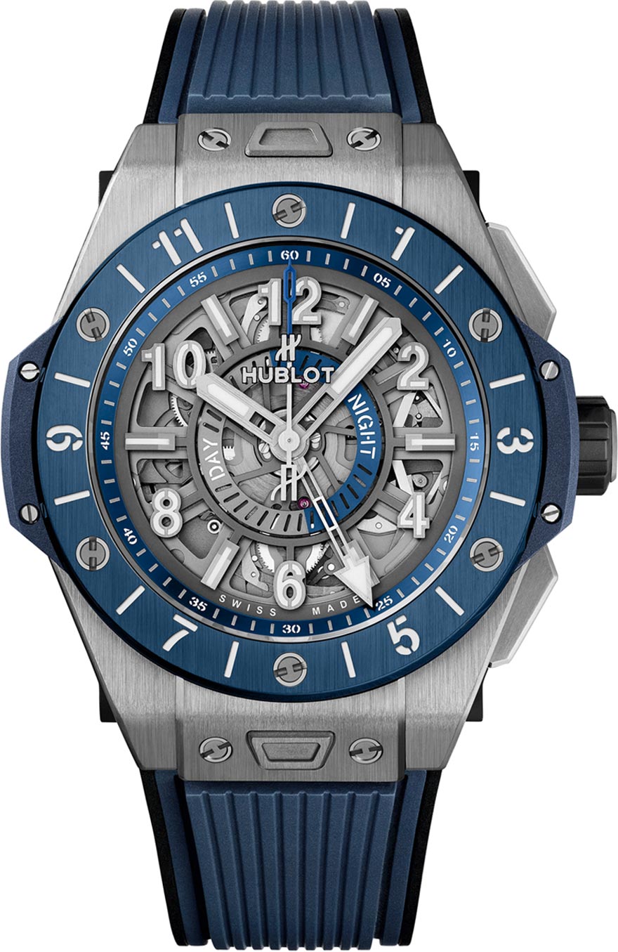 落ち着きある色調のブルーセラミックをベゼルに採用。自社開発・製造ムーブメントCal.HUB1251 UNICO搭載の、デイ&ナイト表示付きGMTモデル。オープンワーク・ダイアルにより精密機構が視認可能。ケースにチタニウムを採用することで装着時の軽量感抜群、手放せない1本となった。