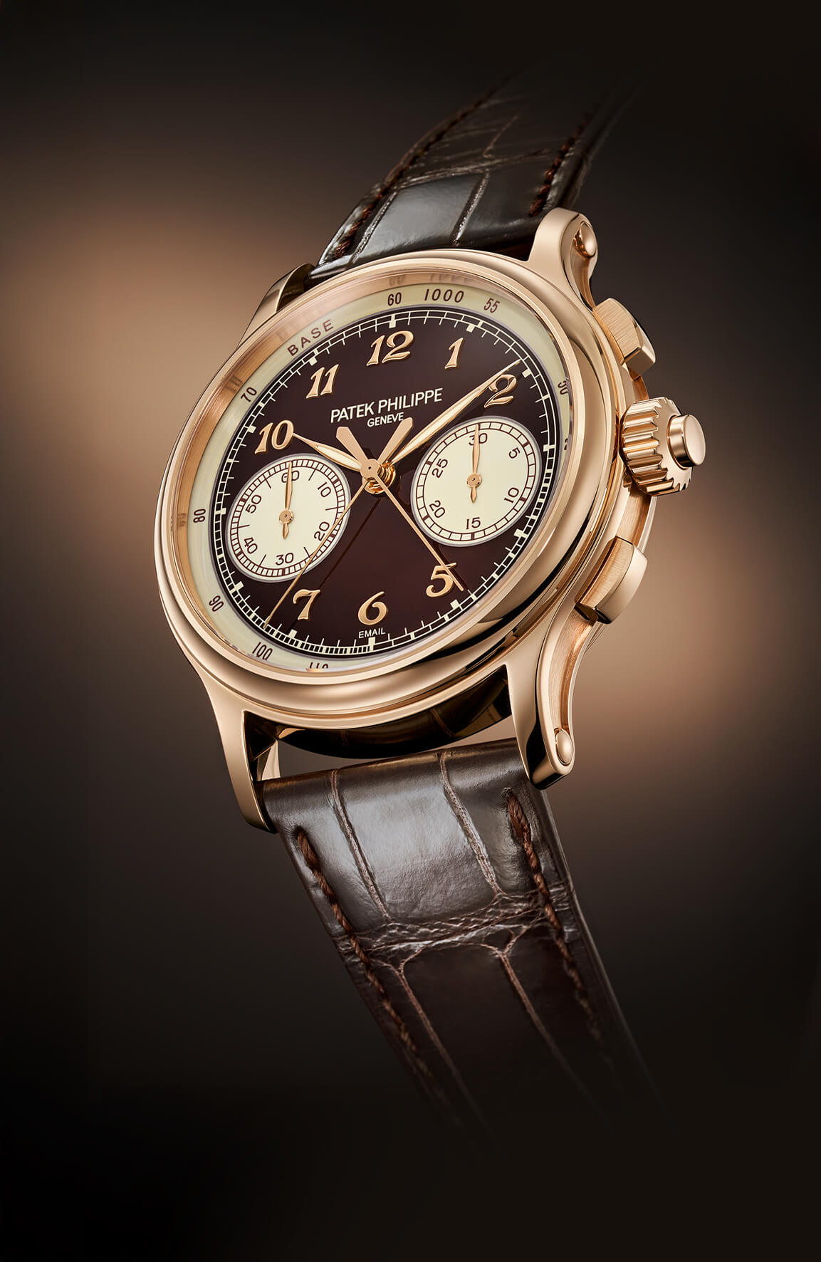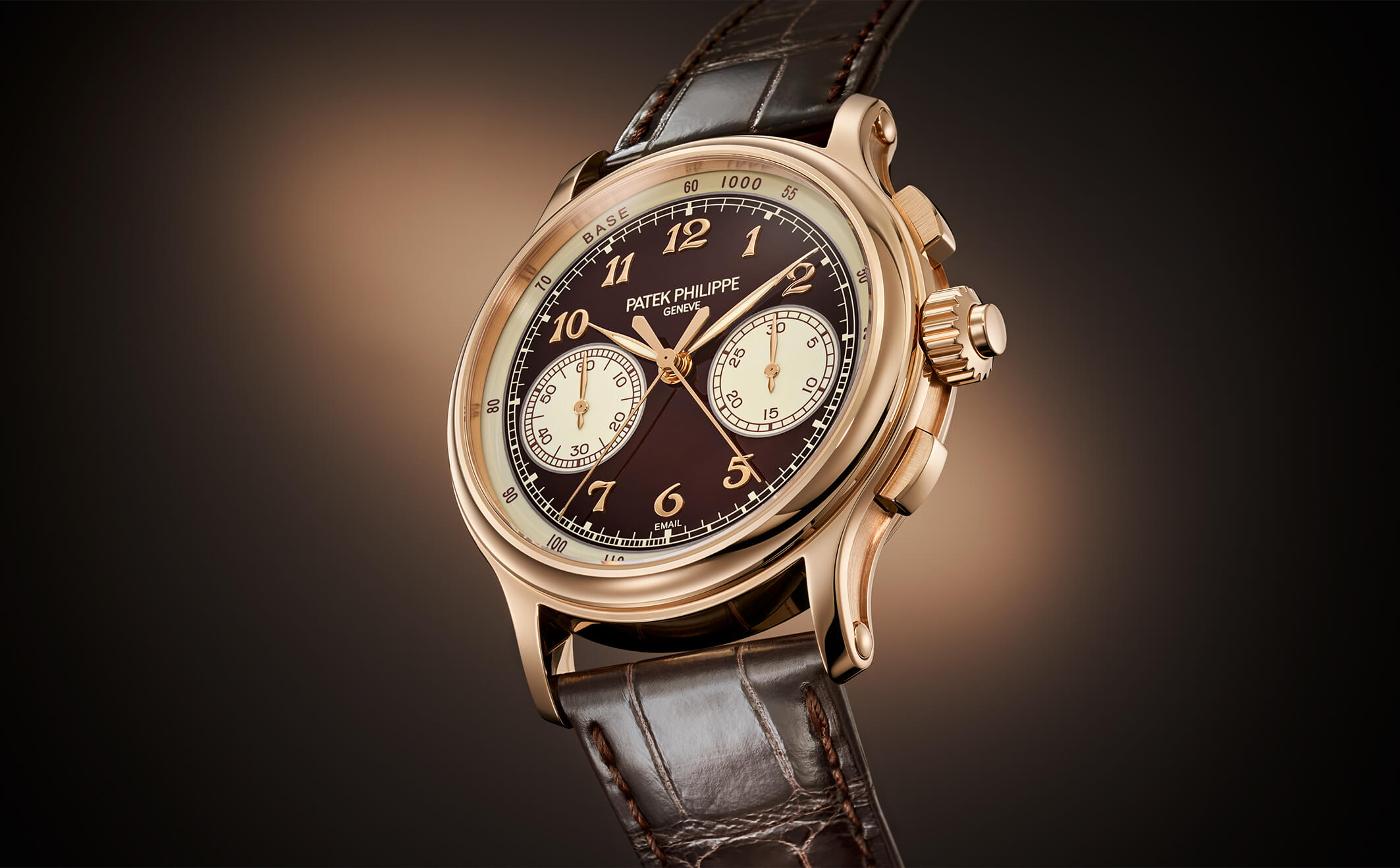 ブラウンの本七宝文字盤とローズゴールドケースの組み合わせが、落ち着いた上品さと洗練された魅力をまとい、パテック フィリップならではの美学を体現している。スプリット秒針クロノグラフの精巧な動きも堪能できる、魅力あふれる一本だ。